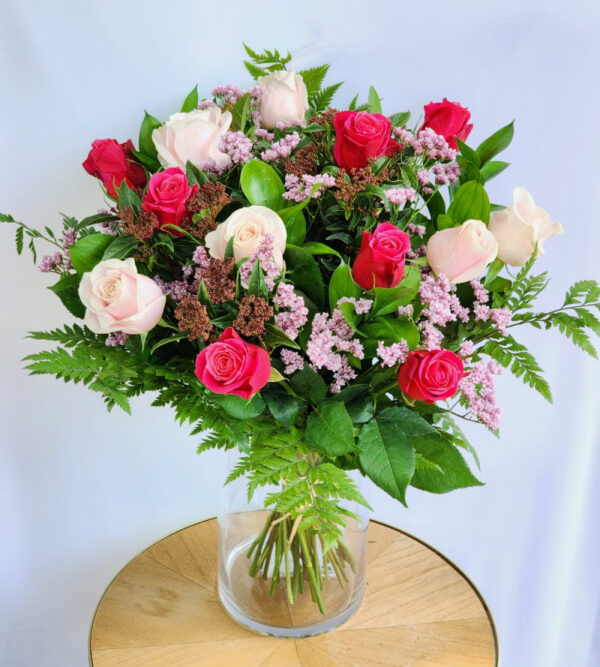 זר פרחים השזור מוורדים ולימוניום בשילוב ירק וענפי קישוט ארוז בעטיפה המתאימה בגוונים לזר.