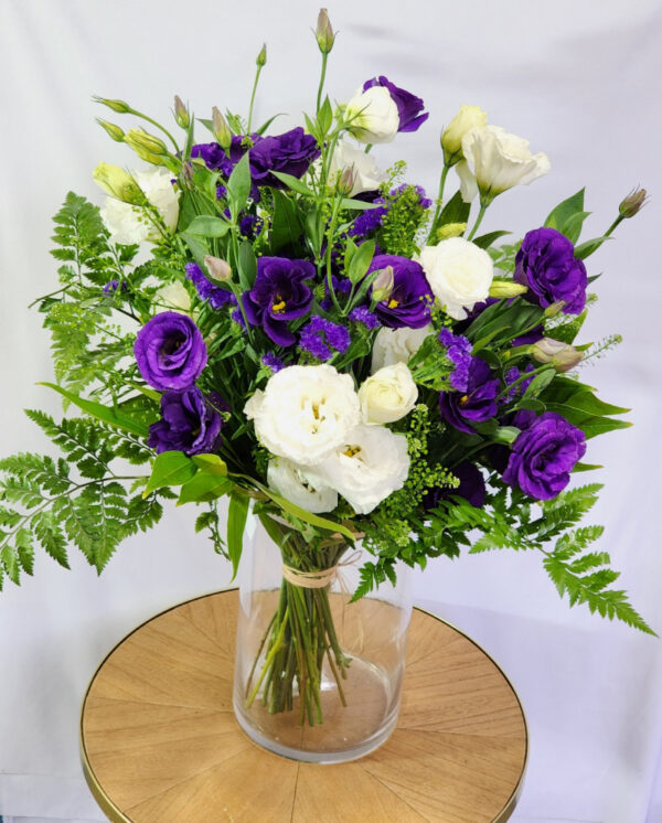 זר פרחים השזור מפרחי ליזיאנטוס בגוונים של סגול ולבן בשילוב ירק וענפי קישוט ארוז בעטיפה המתאימה בגוונים לזר.