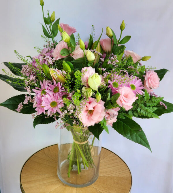 זר פרחים השזור מפרחי חרציות, ליליות וליזיאנטוס בשילוב ירק וענפי קישוט ארוז בעטיפה המתאימה בגוונים לזר.