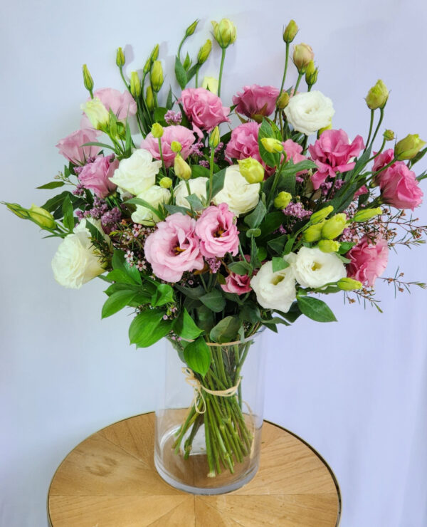 זר פרחים השזור מפרחי ליזיאנטוס בגוונים של ורוד לבן, לימוניום בשילוב ירק וענפי קישוט ארוז בעטיפה המתאימה בגוונים לזר.