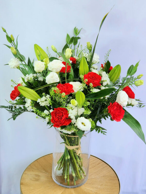 זר פרחים השזור מפרחי ציפורן אדומה, שושן צחור, ליזיאנטוס ועד עד לבן בשילוב ירק וענפי קישוט ארוז בעטיפה המתאימה בגוונים לזר.