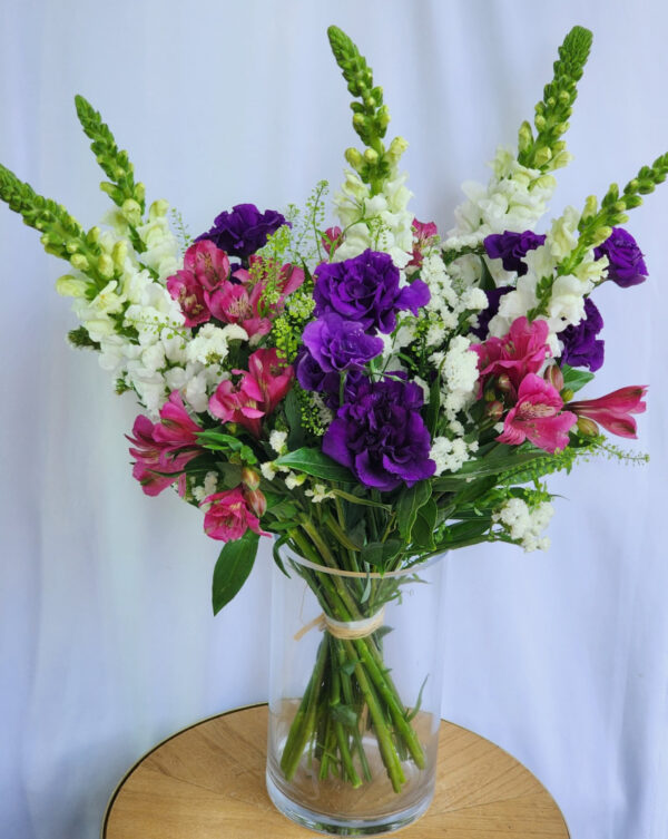 זר פרחים רענן השזור מפרחי ליזיאנטוס, לוע הארי, אלסטומריה ובשילוב ירק וענפי קישוט ארוז בעטיפה המתאימה בגוונים לזר.