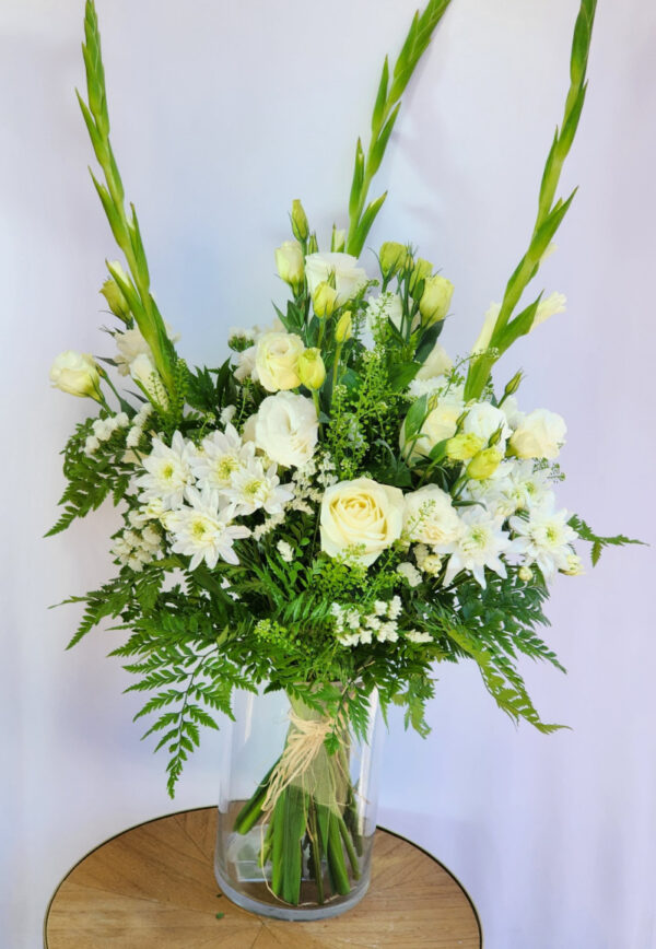 זר פרחים השזור מפרחי ליזיאנטוס, חרציות, וורדים, סייפנים בשילוב ירק וענפי קישוט ארוז בעטיפה המתאימה בגוונים לזר.