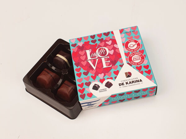 פרלין 4 love קולקציית 4 פרלינים מסדרת love במילוים קטיפתיים: קרם נוגט, קרם מוקה חלבי, ללא גלוטן, 44 גרם