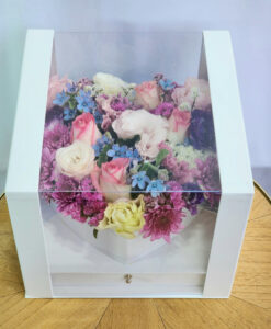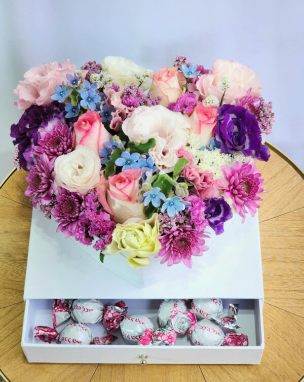 סידור פרחים השזור בתוך פלאוור בוקס בצורת לב מורכב משלל פרחים בגוונים של ורוד סגול ולבן ובשילוב ירק וענפי קישוט
